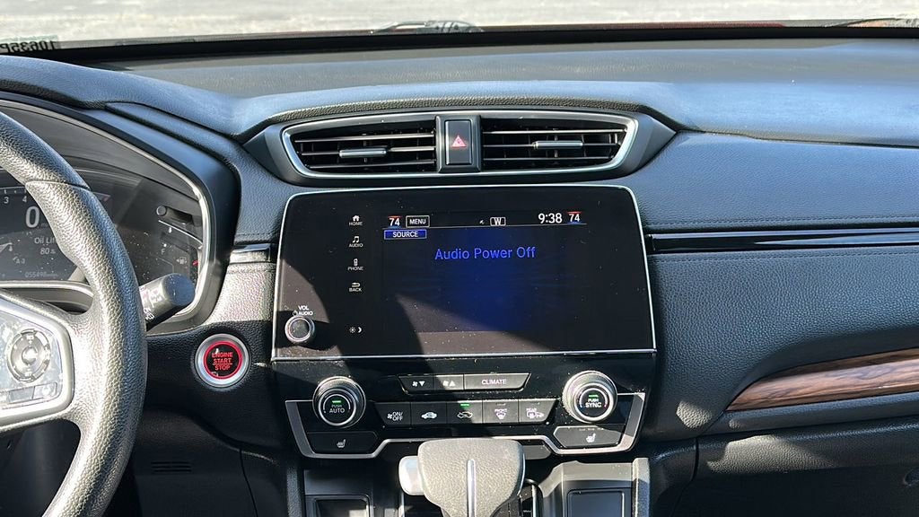 This 2021 Honda CR-V is equipped with 18 Alloy Wheels, 4-Wheel Disc Brakes, 5.64 Axle Ratio, 6 Speakers, ABS brakes, Adaptive Cruise Control: Adaptive Cruise Control (ACC) with Low-Speed Follow, Air Conditioning, Alloy wheels, AM/FM radio: SiriusXM, Apple CarPlay/Android Auto, Auto High-beam Headlights, Automatic temperature control, Blind Spot Information (BSI) System warning, Brake assist, Bumpers: body-color, Cloth Seat Trim, Compass, Delay-off headlights, Driver door bin, Driver vanity mirror, Dual front impact airbags, Dual front side impact airbags, Electronic Stability Control, Exterior Parking Camera Rear, Forward collision: Collision Mitigation Braking System (CMBS) + FCW mitigation, Four wheel independent suspension, Front anti-roll bar, Front Bucket Seats, Front Center Armrest, Front dual zone A/C, Front fog lights, Front reading lights, Heated door mirrors, Heated Front Bucket Seats, Heated front seats, Illuminated entry, Low tire pressure warning, Occupant sensing airbag, Outside temperature display, Overhead airbag, Overhead console, Panic alarm, Passenger door bin, Passenger vanity mirror, Power door mirrors, Power driver seat, Power moonroof, Power steering, Power windows, Radio data system, Radio: 180-Watt AM/FM/HD/SiriusXM Audio System, Rear anti-roll bar, Rear seat center armrest, Rear window defroster, Rear window wiper, Remote keyless entry, Security system, Speed control, Speed-sensing steering, Speed-Sensitive Wipers, Split folding rear seat, Spoiler, Steering wheel mounted audio controls, Tachometer, Telescoping steering wheel, Tilt steering wheel, Traction control, Trip computer, Turn signal indicator mirrors, and Variably intermittent wipers.