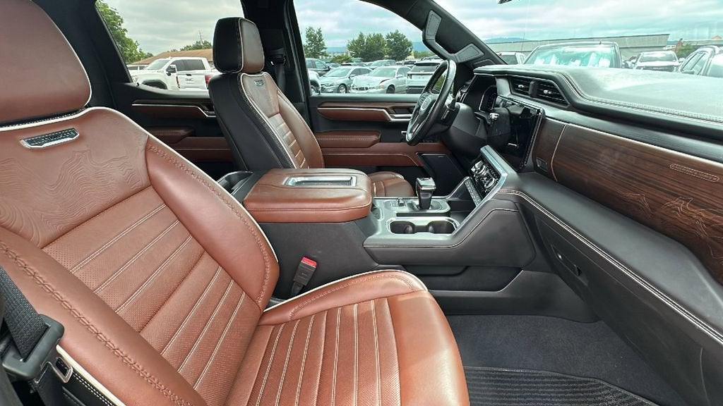This 2022 GMC Sierra 1500 is equipped with Preferred Equipment Group 5SB (120-Volt Bed Mounted Power Outlet, 120-Volt Instrument Panel Power Outlet, 2 Charge/Data USB Ports Inside Center Console, 2 Type-C Charge-Only Rear USB Ports, 2 USB Ports, Auto-Locking Rear Differential, Bed View Camera, Bose Premium Series w/12-Speaker System, Carbon Fiber Composite Bed, Chrome Recovery Hooks, Color-Keyed Carpeting Floor Covering, Compass, Deep-Tinted Glass, Electric Rear-Window Defogger, Electrical Steering Column Lock, Floor-Mounted Center Console, Front Rainsensing Wipers, GMC Connected Access Capable, HD Surround Vision, Heated 2nd Row Outboard Seats, Heated Driver & Front Outboard Passenger Seating, Heavy-Duty Air Filter, Hill Descent Control, Hitch Guidance w/Hitch View, In-Vehicle Trailering App, Integrated Trailer Brake Controller, Keyless Open & Start, LED Cargo Area Lighting, Multicolor 15 Diagonal Head-Up Display, MultiPro Audio System by Kicker (LPO), OnStar & GMC Connected Services Capable, Perimeter Lighting, Power Door Locks, Power Front Passenger Windows w/Express Up/Down, Power Front Windows w/Driver Express Up/Down, Power Rake & Telescoping Steering Column, Power Rear Windows w/Express Down, Power Sliding Rear Window w/Rear Defogger, Power Sunroof, Push Button Start, Rear Cross Traffic Braking, Rear Pedestrian Detection, Remote Vehicle Starter System, SiriusXM w/360L, Steering Wheel Audio Controls, Theft Deterrent System (Unauthorized Entry), Trailer Camera Provisions, Trailer Side Blind Zone Alert, Trailer Tire Pressure Monitor System, Ultrasonic Front & Rear Park Assist, Universal Home Remote, Vader Chrome Header w/Signature Denali Grille, Ventilated Driver & Front Passenger Seats, Wi-Fi Hotspot Capable, Wireless Charging, and Wireless Phone Projection), Trailering Package (Hitch Guidance), 10-Speed Automatic, 4WD, Alpine Umber Leather, Navigation System, 12 Speakers, 16-Way Power Driver Seat Adjuster w/Lumbar, 16-Way Power Passenger Seat Adjuster w/Lumbar, 170 Amp Alternator, 220 Amp Alternator, 3.23 Rear Axle Ratio, 4-Wheel Disc Brakes, ABS brakes, Adaptive suspension, Air Conditioning, Alloy wheels, AM/FM radio: SiriusXM with 360L, Apple CarPlay/Android Auto, Auto High-beam Headlights, Auto-dimming door mirrors, Auto-dimming Rear-View mirror, Automatic Emergency Braking, Automatic temperature control, Brake assist, Buckle to Drive, Bumpers: body-color, Delay-off headlights, Denali Premium Suspension w/Adaptive Ride Control, Driver door bin, Driver Memory, Driver vanity mirror, Dual front impact airbags, Dual front side impact airbags, Electronic Stability Control, Emergency communication system: OnStar and GMC Connected Services capable, Engine Block Heater, Enhanced Automatic Emergency Braking, Following Distance Indicator, Forward Collision Alert, Front anti-roll bar, Front Bucket Seats, Front Center Armrest, Front dual zone A/C, Front fog lights, Front Pedestrian Braking, Front reading lights, Front wheel independent suspension, Full Grain Leather Seat Trim, Fully automatic headlights, Garage door transmitter, Genuine wood console insert, Genuine wood dashboard insert, Genuine wood door panel insert, Heads-Up Display, Heated door mirrors, Heated front seats, Heated rear seats, Heated steering wheel, Illuminated entry, IntelliBeam Automatic High Beam On/Off, Lane Keep Assist w/Lane Departure Warning, Low tire pressure warning, Memory seat, Not Equipped w/Steering Column Lock, Not Equipped w/Super Cruise/Auto Emergency Braking, Occupant sensing airbag, Outside temperature display, Overhead airbag, Overhead console, Panic alarm, Passenger door bin, Passenger vanity mirror, Power door mirrors, Power driver seat, Power moonroof, Power passenger seat, Power steering, Power windows, Premium audio system: GMC Infotainment System, Radio data system, Radio: Premium GMC Infotainment Audio System, Rain sensing wipers, Rear reading lights, Rear seat center armrest, Rear step