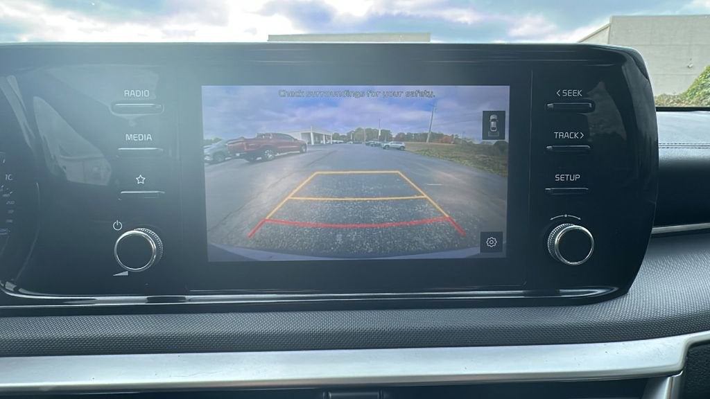 This 2023 Kia K5 is equipped with 4-Wheel Disc Brakes, 6 Speakers, ABS brakes, Air Conditioning, Alloy wheels, AM/FM radio, Auto High-beam Headlights, Automatic temperature control, Brake assist, Bumpers: body-color, Cargo Net, Carpeted Floor Mats, Cloth Seat Trim, Delay-off headlights, Driver door bin, Driver vanity mirror, Dual front impact airbags, Dual front side impact airbags, Electronic Stability Control, Four wheel independent suspension, Front anti-roll bar, Front Bucket Seats, Front Center Armrest, Front dual zone A/C, Front reading lights, Fully automatic headlights, Heated door mirrors, Illuminated entry, Knee airbag, Low tire pressure warning, Occupant sensing airbag, Outside temperature display, Overhead airbag, Overhead console, Panic alarm, Passenger door bin, Passenger vanity mirror, Power door mirrors, Power steering, Power windows, Radio data system, Radio: AM/FM/MP3 Audio System, Rear anti-roll bar, Rear seat center armrest, Rear side impact airbag, Rear window defroster, Remote keyless entry, Security system, Speed control, Speed-sensing steering, Split folding rear seat, Steering wheel mounted audio controls, Tachometer, Telescoping steering wheel, Tilt steering wheel, Traction control, Trip computer, Variably intermittent wipers, and Wheels: 16 Gray Alloy.