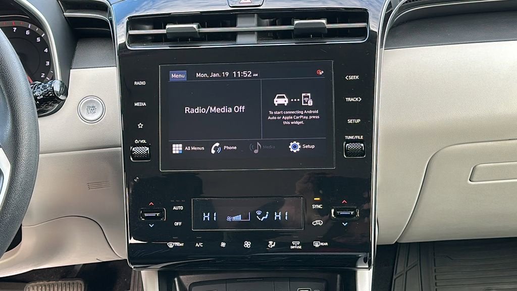 This 2024 Hyundai Tucson is equipped with Option Group 01, AWD, 3.648 Axle Ratio, 4-Wheel Disc Brakes, 6 Speakers, ABS brakes, Air Conditioning, Alloy wheels, AM/FM radio: SiriusXM, Apple CarPlay & Android Auto, Auto High-beam Headlights, Automatic temperature control, Brake assist, Bumpers: body-color, Delay-off headlights, Driver door bin, Driver vanity mirror, Dual front impact airbags, Dual front side impact airbags, Electronic Stability Control, Emergency communication system: Blue Link Connected Car Service (3-year complimentary subscription), Exterior Parking Camera Rear, Four wheel independent suspension, Front anti-roll bar, Front Bucket Seats, Front Center Armrest, Front dual zone A/C, Front reading lights, Fully automatic headlights, Heated door mirrors, Heated Front Bucket Seats, Heated front seats, Illuminated entry, Low tire pressure warning, Occupant sensing airbag, Outside temperature display, Overhead airbag, Overhead console, Panic alarm, Passenger door bin, Passenger vanity mirror, Power door mirrors, Power driver seat, Power Liftgate, Power steering, Power windows, Radio data system, Radio: AM/FM/HD Audio System, Rear anti-roll bar, Rear seat center armrest, Rear side impact airbag, Rear window defroster, Rear window wiper, Remote keyless entry, Roof rack: rails only, Security system, Speed control, Split folding rear seat, Spoiler, Stain & Odor Resistant Cloth Seat Trim, Steering wheel mounted audio controls, Tachometer, Telescoping steering wheel, Tilt steering wheel, Traction control, Trip computer, Variably intermittent wipers, Wheels: 17 x 7.0J Alloy, and Wheels: 19 x 7.5J Machine-Face Finish Alloy.