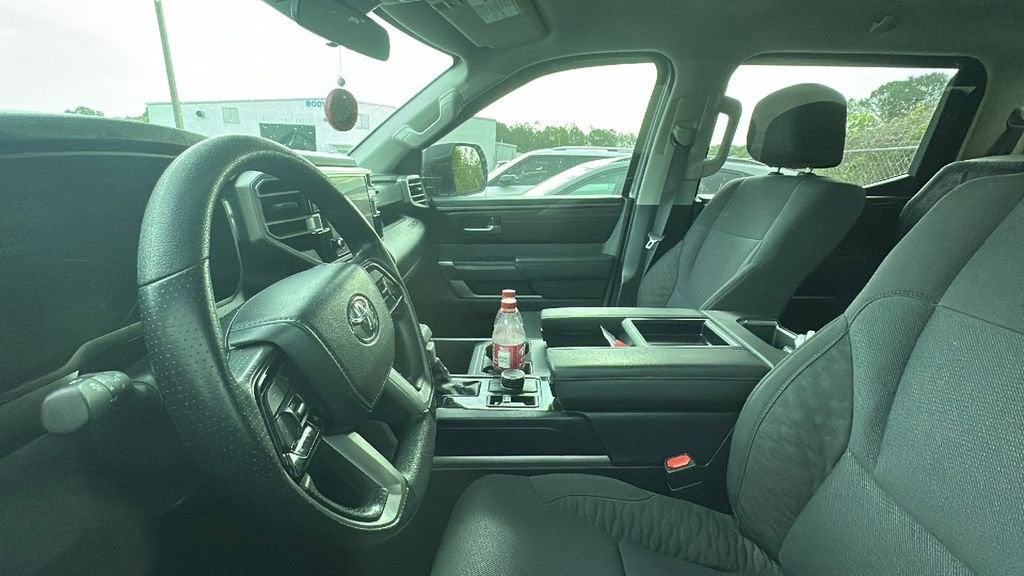 This 2024 Toyota Tundra is equipped with SR5 Convenience Package (32 Gallon Fuel Tank, Blind Spot Monitor w/Lane Change Assist, and Parking Support Alert/Brake), 4WD, Black Cloth, 18 Alloy Wheels, 3.31 Axle Ratio, 4-Way Adjustable Front Bucket Seats, 4-Wheel Disc Brakes, 9 Speakers, ABS brakes, Air Conditioning, Alloy wheels, AM/FM radio: SiriusXM, Apple CarPlay/Android Auto, Auto High-beam Headlights, Automatic temperature control, Blind Spot Monitor, Brake assist, Bumpers: body-color, Delay-off headlights, Driver door bin, Driver vanity mirror, Dual front impact airbags, Dual front side impact airbags, Electronic Stability Control, Emergency communication system: Safety Connect (10-year trial), Exterior Parking Camera Rear, Fabric Seat Trim (FB), Front anti-roll bar, Front Bucket Seats, Front Center Armrest, Front fog lights, Front reading lights, Front wheel independent suspension, Fully automatic headlights, Heated door mirrors, Heated Power Black Outside Mirrors, Illuminated entry, Knee airbag, Low tire pressure warning, Occupant sensing airbag, Outside temperature display, Overhead airbag, Overhead console, Panic alarm, Passenger door bin, Passenger vanity mirror, Power door mirrors, Power steering, Power windows, Radio data system, Radio: Audio Multimedia System, Rear reading lights, Rear step bumper, Rear window defroster, Remote keyless entry, Safety Connect, Security system, Speed control, Speed-sensing steering, Split folding rear seat, Steering wheel mounted audio controls, Tachometer, Telescoping steering wheel, Tilt steering wheel, Traction control, Trip computer, Variably intermittent wipers, and Voltmeter.