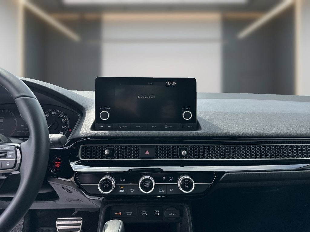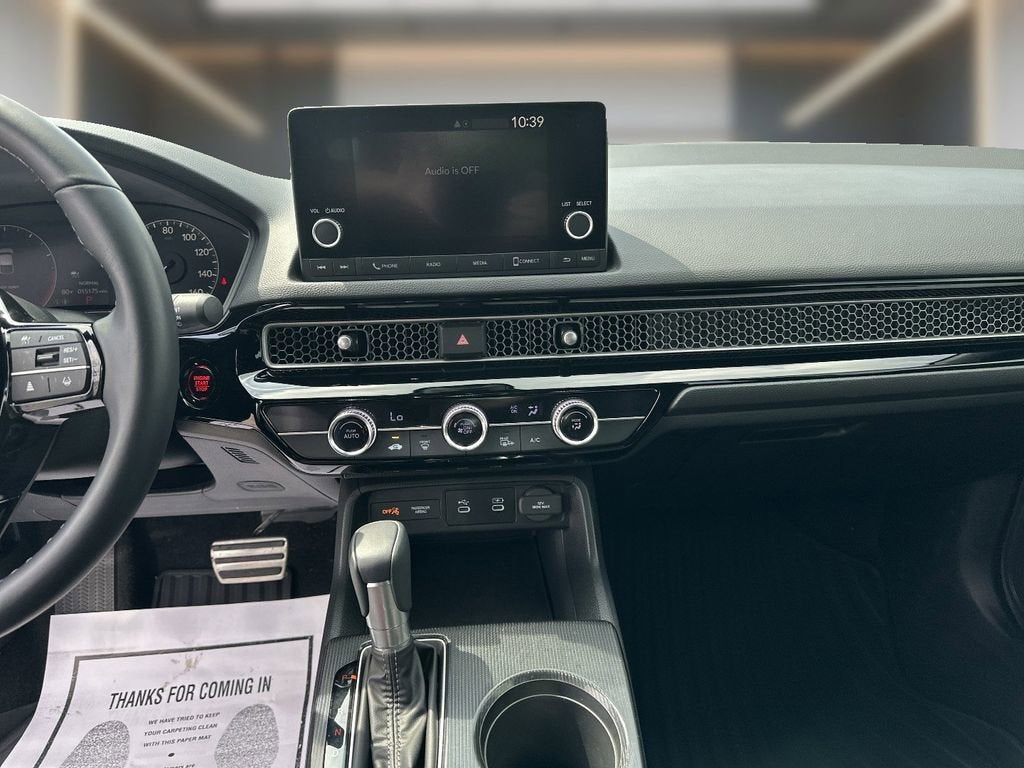 This 2025 Honda Civic is equipped with Black w/Cloth Seating Surfaces, 4-Wheel Disc Brakes, 8 Speakers, ABS brakes, Adaptive Cruise Control: Adaptive Cruise Control (ACC) with Low-Speed Follow, Air Conditioning, Alloy wheels, AM/FM radio, Apple CarPlay/Android Auto, Auto High-beam Headlights, Automatic temperature control, Blind Spot Information (BSI) System warning, Brake assist, Bumpers: body-color, Cloth/Leatherette Seating Surfaces, Delay-off headlights, Driver door bin, Driver vanity mirror, Dual front impact airbags, Dual front side impact airbags, Electronic Stability Control, Emergency communication system: HondaLink, Exterior Parking Camera Rear, Four wheel independent suspension, Front anti-roll bar, Front Bucket Seats, Front Center Armrest, Front reading lights, Fully automatic headlights, Heated door mirrors, Illuminated entry, Knee airbag, Lane departure: Lane Keeping Assist System (LKAS) active, Leather Shift Knob, Low tire pressure warning, Occupant sensing airbag, Outside temperature display, Overhead airbag, Panic alarm, Passenger door bin, Passenger vanity mirror, Power door mirrors, Power steering, Power windows, Radio data system, Radio: 180-Watt Audio System, Rear anti-roll bar, Rear side impact airbag, Rear window defroster, Rear window wiper, Remote keyless entry, Security system, Speed control, Speed-sensing steering, Split folding rear seat, Steering wheel mounted audio controls, Tachometer, Telescoping steering wheel, Tilt steering wheel, Traction control, Trip computer, and Wheels: 18 Gloss Black Alloy.