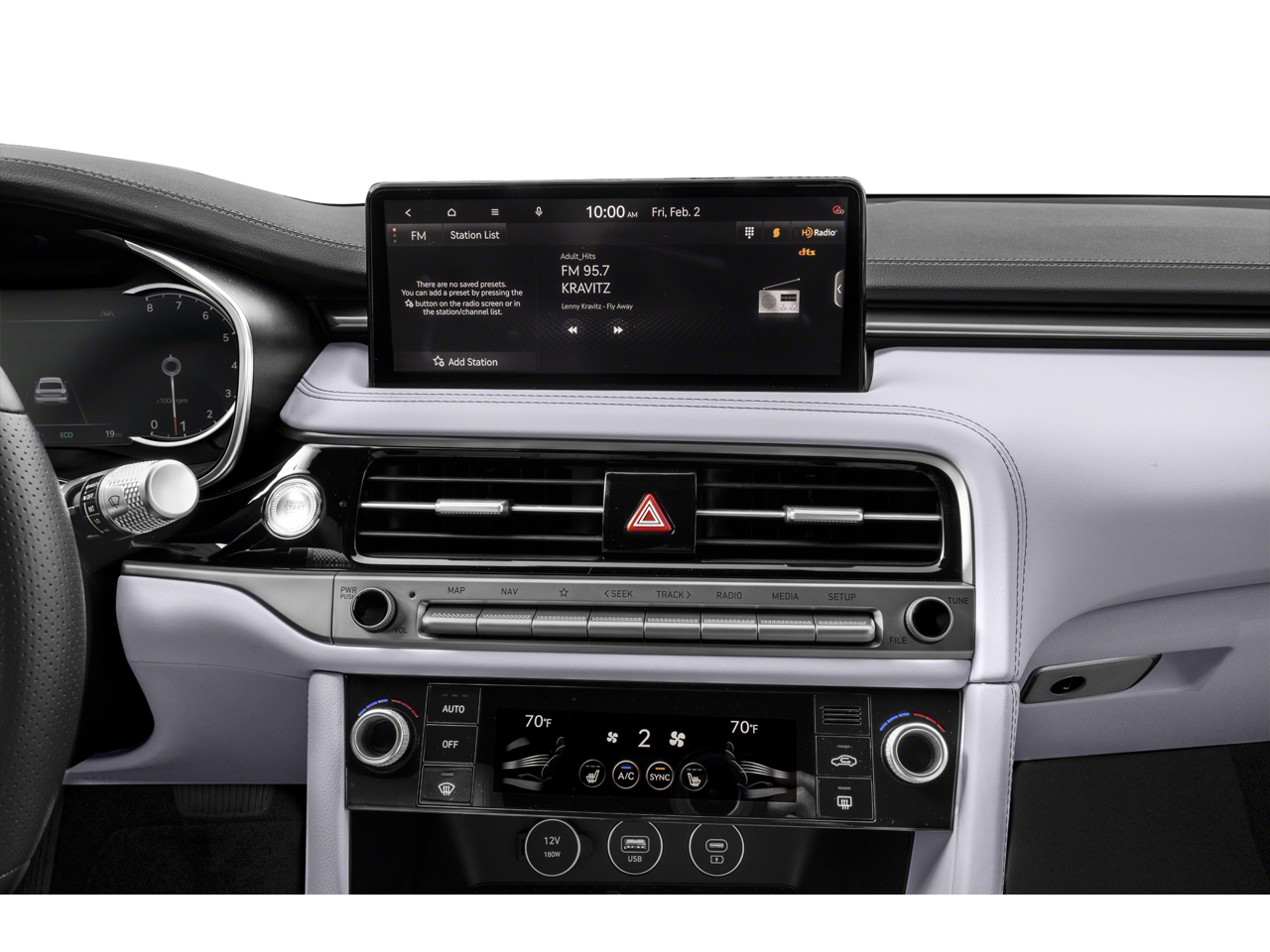 - Radio: AM/FM/HD Lexicon Prem Audio System -inc: QuantumLogic surround sound, 15 high efficiency speakers including 2 subwoofers, Lexicon 11-channel digital external amplifier, speed-sensing, 5th generation navigation system w/10.25" touchscreen, dynamic voice recognition, connected routing, over the air updates, Android Auto and Apple CarPlay, USB connectivity, SiriusXM satellite radio w/90-day trial subscription (not available in Alaska or Hawaii), Genesis connected services, Bluetooth® hands-free phone and audio streaming system